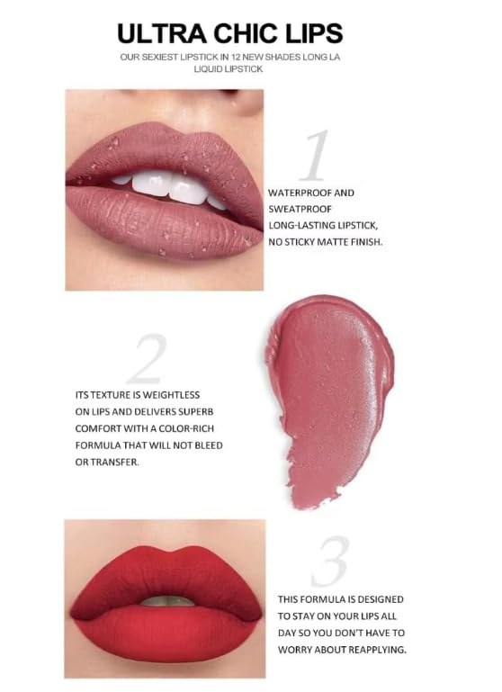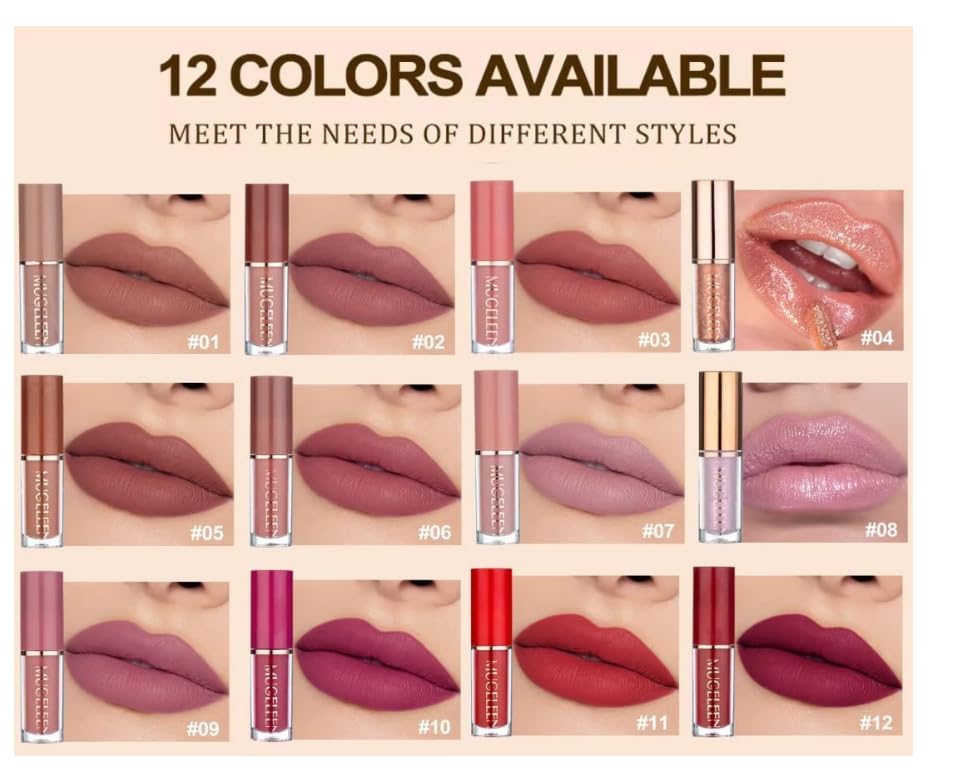 12 Matte Liquid Lipsticks: Includes 12 stunning shades from nude to bold. Highly pigmented, lightweight formula delivers a smooth, glamorous matte finish that lasts all day.