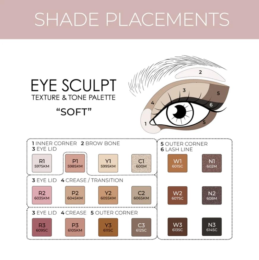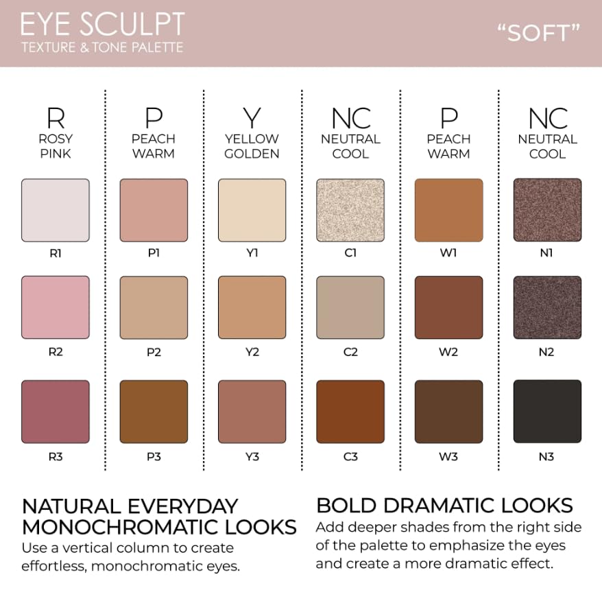 The palette features an innovative user-friendly system, with varying undertones and buildable textures to create versatile eye looks across all skin tones in mostly matte shades. This essential palette can be used alone or paired with other colorful eyeshadow palettes as a structural base.