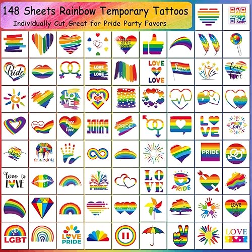 ⚡Set Includes 148 Mixed Rainbow Tattoos for Rainbow Party Favors -- Super adorable and waterproof pride temporary tattoos,you can use for different locations on your face, arms, calves, etc. Rainbow fake tattoos could be an excellent way to show your pride.