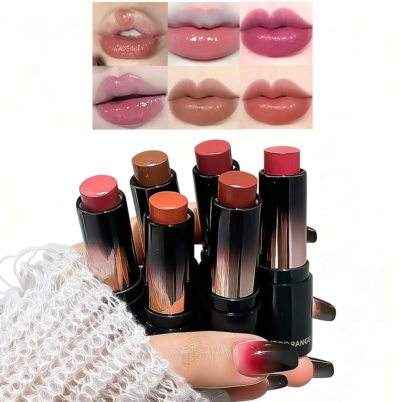 LUXURY SET: Premium collection of 6 moisturizing lipsticks featuring tea-infused formula in complementary nude and peachy shades